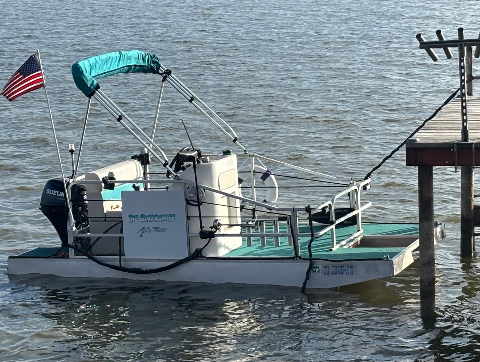 So, I started looking around, and as common as they seemed to be there, they were pretty rare here in Texas. But, in the spring of 2025, I found one and purchased an AquaCraft Little River Boat 9.9 secondhand from a retired couple that live on the Brazos River near Grandbury. It had a bare deck and was powered by an 8 HP Mercury tiller. She was a little dinged up in the front and had obviously sat in the river at their dock for long periods, the Bimini top was toast, but she was overall in good shape.